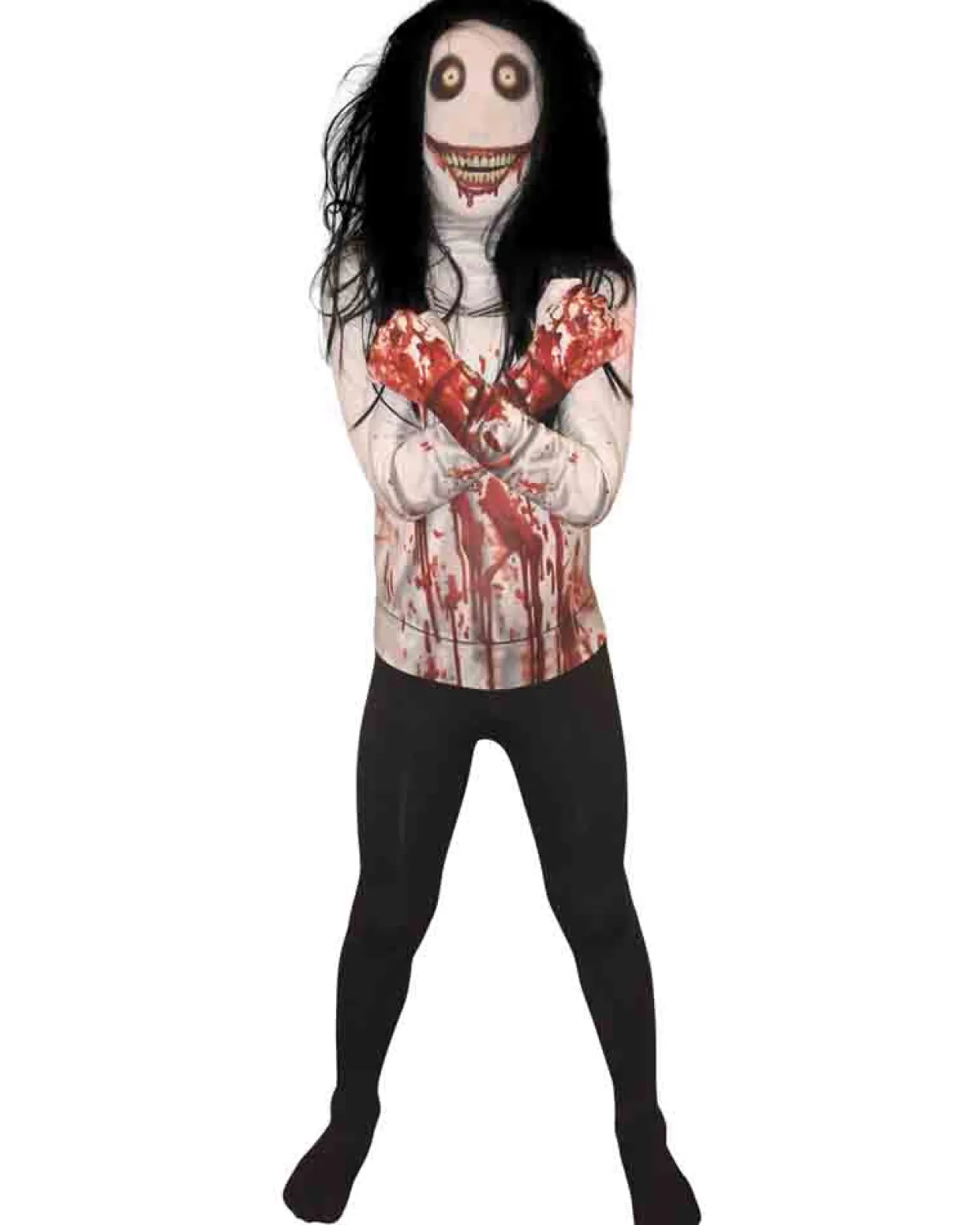 Get Ready To Give Everyone A Scare This Halloween In This Jeff The Killer Morphsuit Boys Costume. Morphsuit Comes In White Top Half With Blood Dripping Down, Black Bottom Half, White Face With Jacks Signature No Eyelids Eyes And Big Gummy Smile. Also Includes A Long Black Wig. Features A Zip And A Hood With Quick Release Velcro On The Back Of The Head For Easy Removal. You’Ll Find Him Hiding In Your Closet, Waiting For You To Come Home.