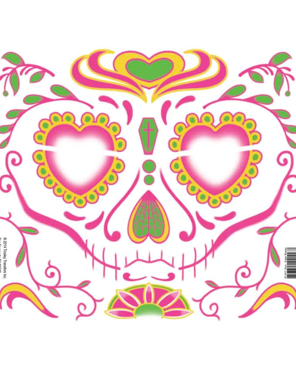 Achieve Your Day Of The Dead Look This Year Without The Stress Of Make Up With This Awesome Sugar Woman Face Tattoo! This Tattoo Features A Pink Sugar Skull Design That Covers The Majority Of Your Face. The Tattoo Transfers With Water And Application Instructions Are Included On The Back Of The Packet.