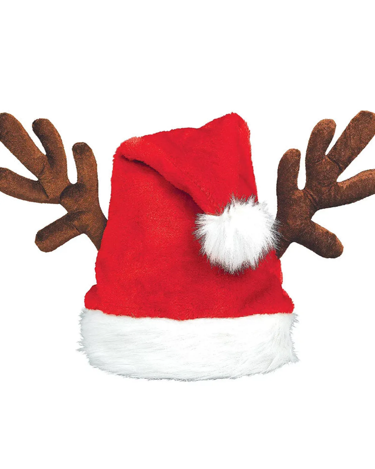 Dress As Both Santa And One Of His Trusty Reindeer When You Wear This Santa Hat With Antlers. This Clever Hat His Designed To Look Just Like Santa’s Red Hat With White Trim But There Is A Twist… Attached At The Sides Are Two Brown Reindeer Antlers To Make This Hat Extra Special For Christmas. Wear This Hat With Our Other Christmas Accessories And Costumes.