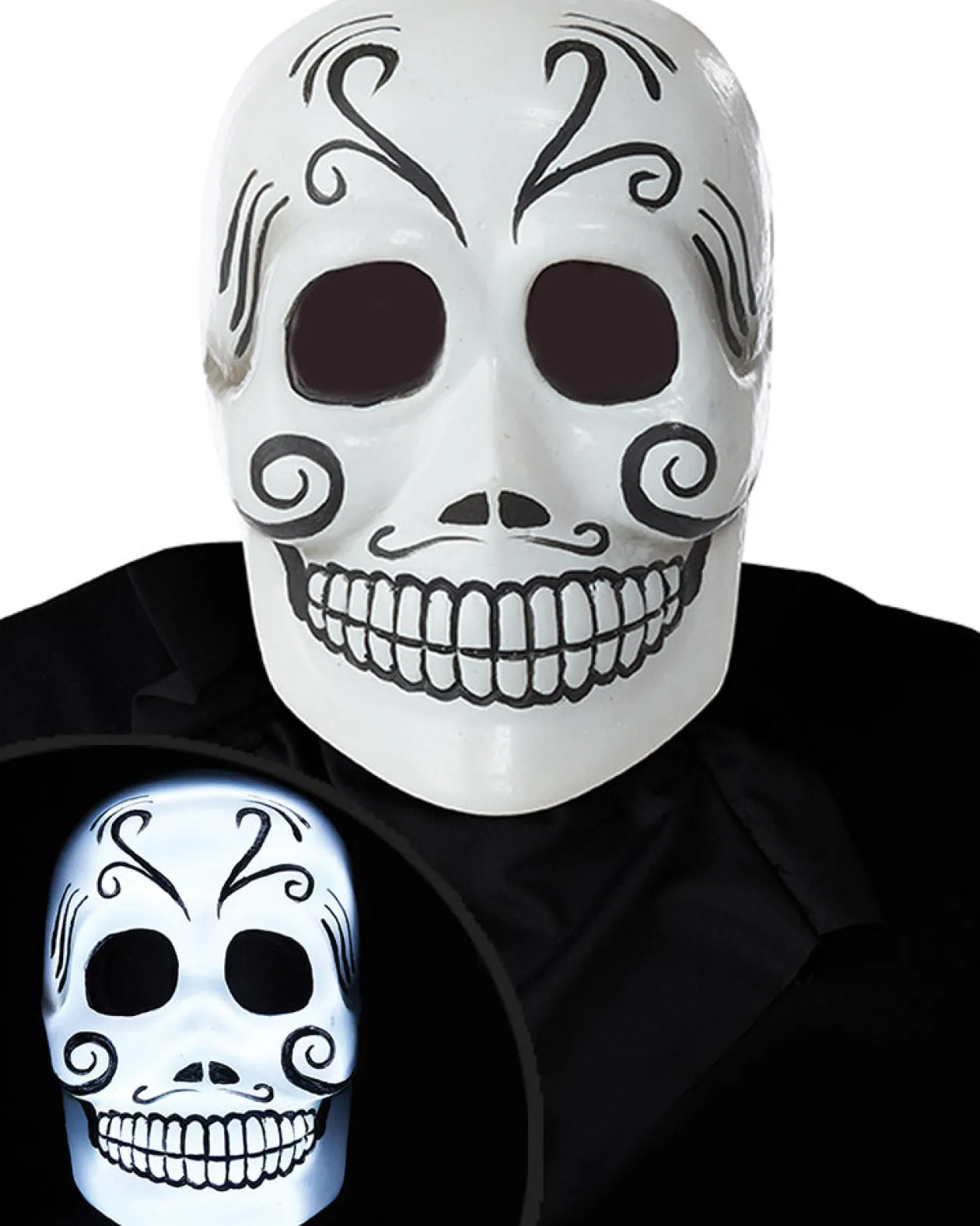 This Dia De Los Muertos Light Up Mask Is Perfect For Adding To Your Next Halloween Costume As A Spooky Sugar Skull Or Your Next Day Of The Dead Event. Not Only Does This Mask Feature A White Sugar Skull Head With Black Detailing, Just Like A Classic Sugar Skull, But It Also Lights Up So You Can Wear It All Night Long At Your Event. The Battery Pack Is Connected To The Mask With A Long 91Cm Cord That You Can Tuck Into Your Costume And Also Features The Function To Change Between Three Light Settings: Glow, Slow Flash And Fast Strobe. The Choice Is Yours This Halloween.