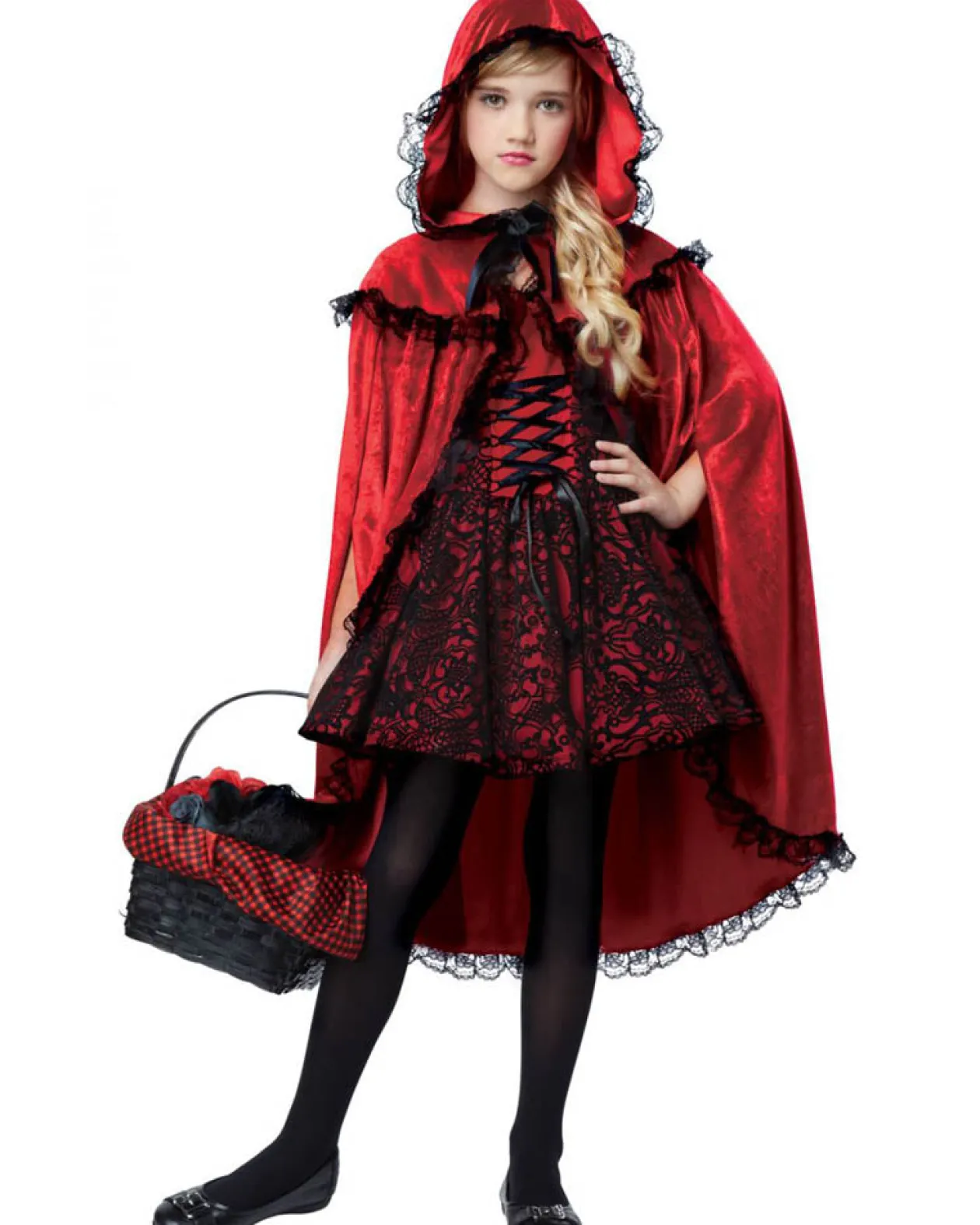 This Red Riding Hood Deluxe Girls Costume Is A Dark Twist On The Classic Fairytale Look. This Costume Comes With A Black Lace Trimmed Hooded Cloak And An Intricately Patterned Red And Black Dress With A Lace Up Front Panel. Perfect For Halloween!