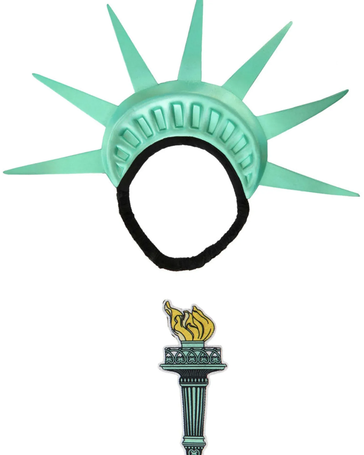 Transform Yourself Into Lady Liberty With This Statue Of Liberty Headband And Torch Set. This Set Includes A Light Aqua Large Foam Crown Headpiece With A Metallic Finish. The Headpiece Features A Black Elastic Band To Keep The Piece In Place. There Is An Included Handheld Felt Prop Which Features A Printed Image Of The Statue Of Liberty’s Torch, With A Yellow Flame. Around The Back Of The Prop Is An Elastic Band For You To Grip.