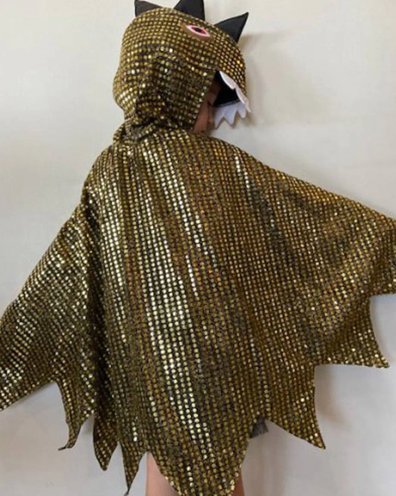 Your Little One Would Appreciate Our Golden Dragon Cape. Featuring A Dragon Cape With Gold Sequin, An Attached Hood With White Teeth, Black Horns, A Sawtooth Hem With A Piercing Pair Of Red Eyes.
