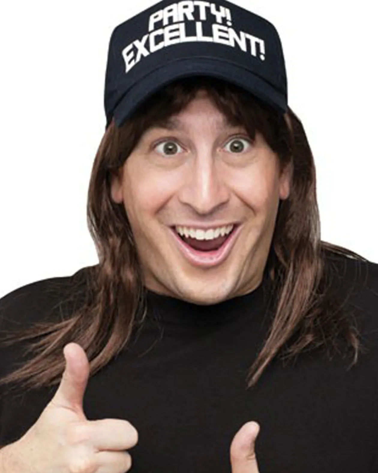 Dare To Play Stairway To Heaven And Rock Out To Bohemian Rhapsody In This Super Cool Excellent Hat With Hair, Inspired By Wayne Campbell From The Movie Wayne’s World. The Hat Is A Cap With Attached Long Brown Hair, Just Like Wayne And The Words “Party!” And “Excellent” Printed On The Front.