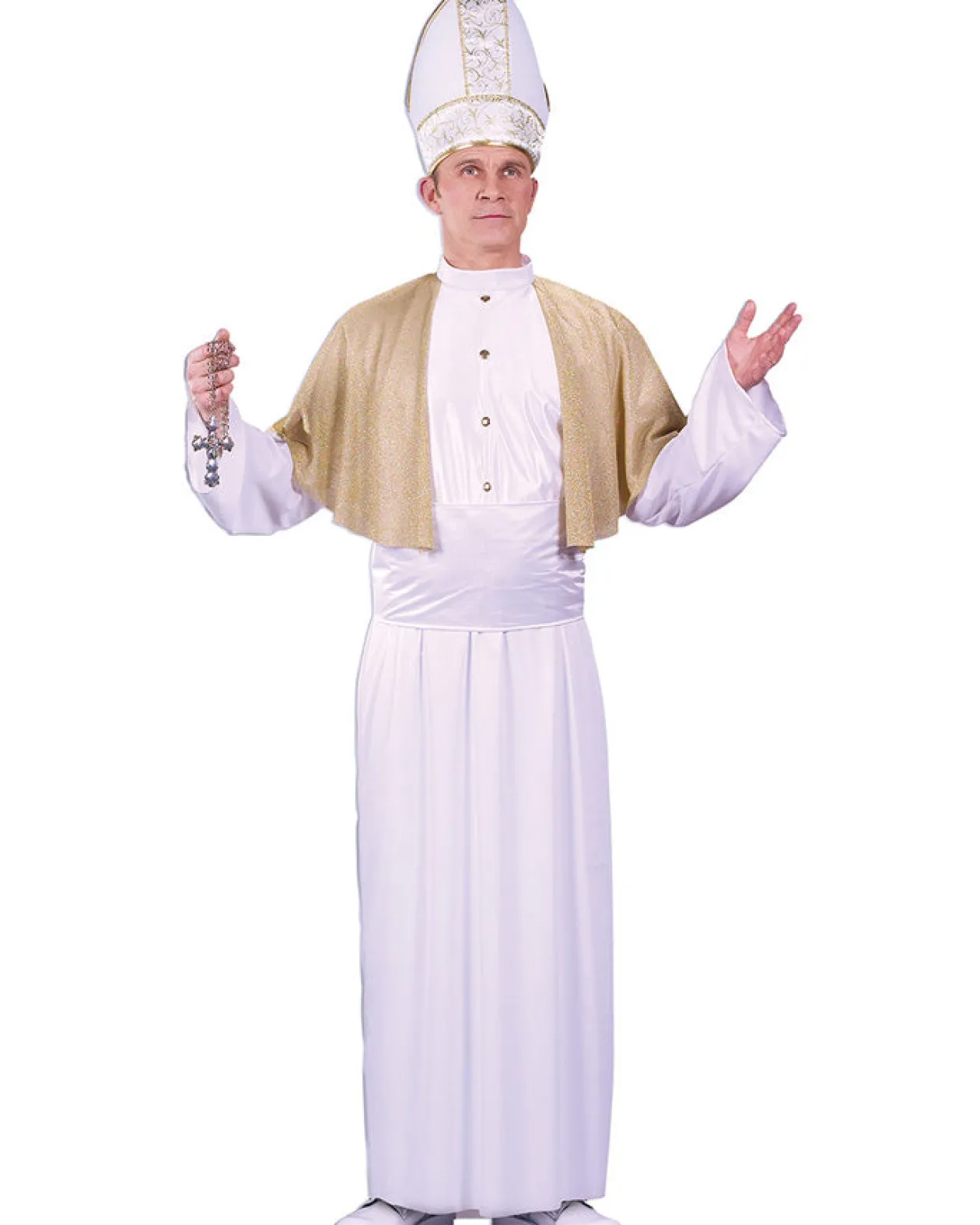 Our Pontiff Mens Costume Includes A Long White Robe With A Detachable Collar And Golden Lamé Capelet And White Sash. The Miter Hat Is White With Gold Embroidery And Tops The Look Off Perfectly. Great For A Couples Idea When Paired With One Of Our Nun Costumes.
