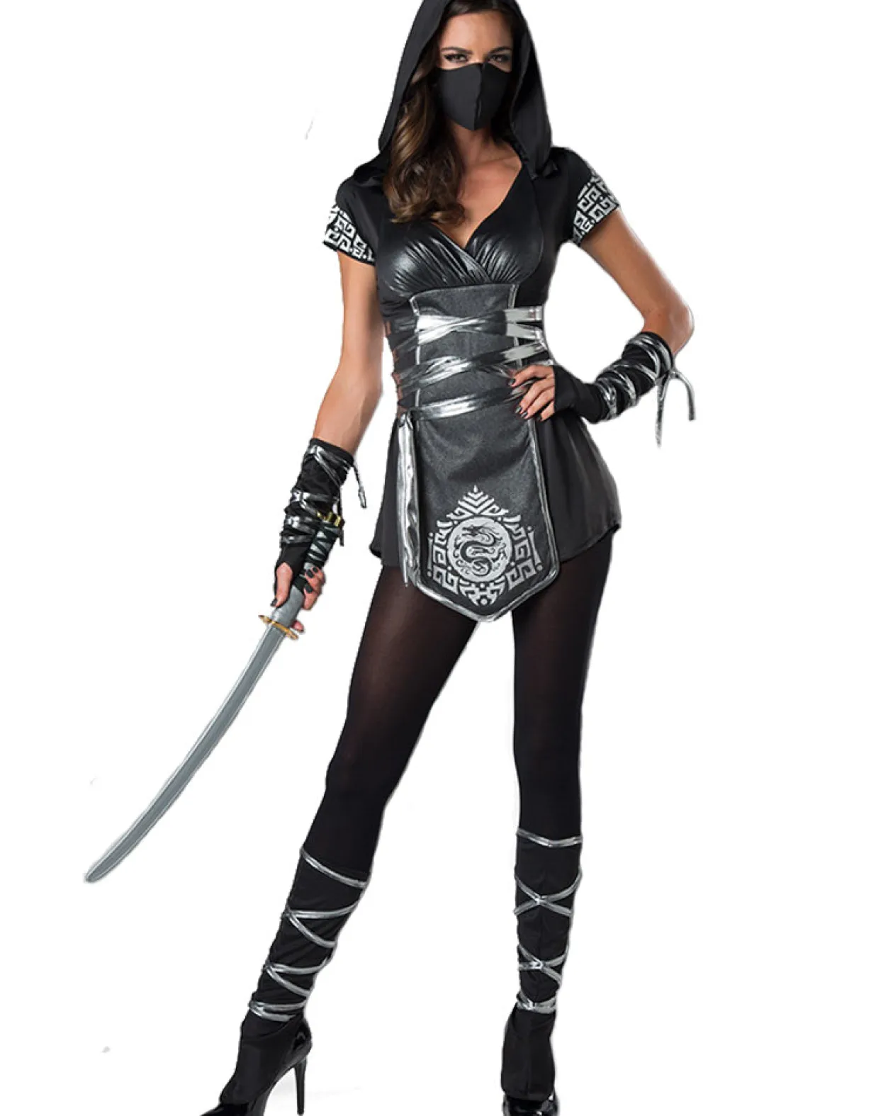 Defeat Your Enemies With Our Ninja Warrioress Womens Costume. Featuring A Women’s Warrior Costume Including A Hooded Black Dress With A Silver Trim Styled With An Attached Front Panel, Intricate Chinese Print, Silver Wrappings, And Short Off The Shoulder Sleeves. The Costume Comes Complete With A Pair Of Glovelets Styled With Matching Silver Wrappings, In Addition, The Costume Features A Black Face Mask, Black Leggings, And Boot Covers With Silver Leg Wrappings.