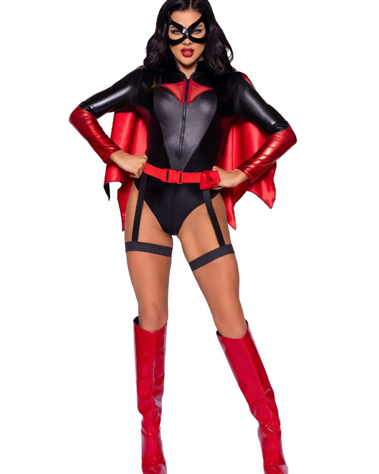 Come As A Sexy Twist On A Superhero With This Vigilante Vixen Womens Costume. Included Is A Black-And-Red, Long-Sleeve Bodysuit, Detachable Black-And-Red Cape, Red Belt With Attached Black Thigh Garters, And A Black, Wet-Look Vinyl Eye Mask. Bodysuit Has A Sexy Front Zip, Shiny Red Half-Sleeves, And A Cheeky Cut Back. Save The Day And Look Damn Hot Doing It! Pair With Black Or Red Knee-High Boots For A Perfectly Coordinated Look. Perfect For Halloween, Superheroes And Villains, Letter B, Black/Red, Or Movie Themed Parties.