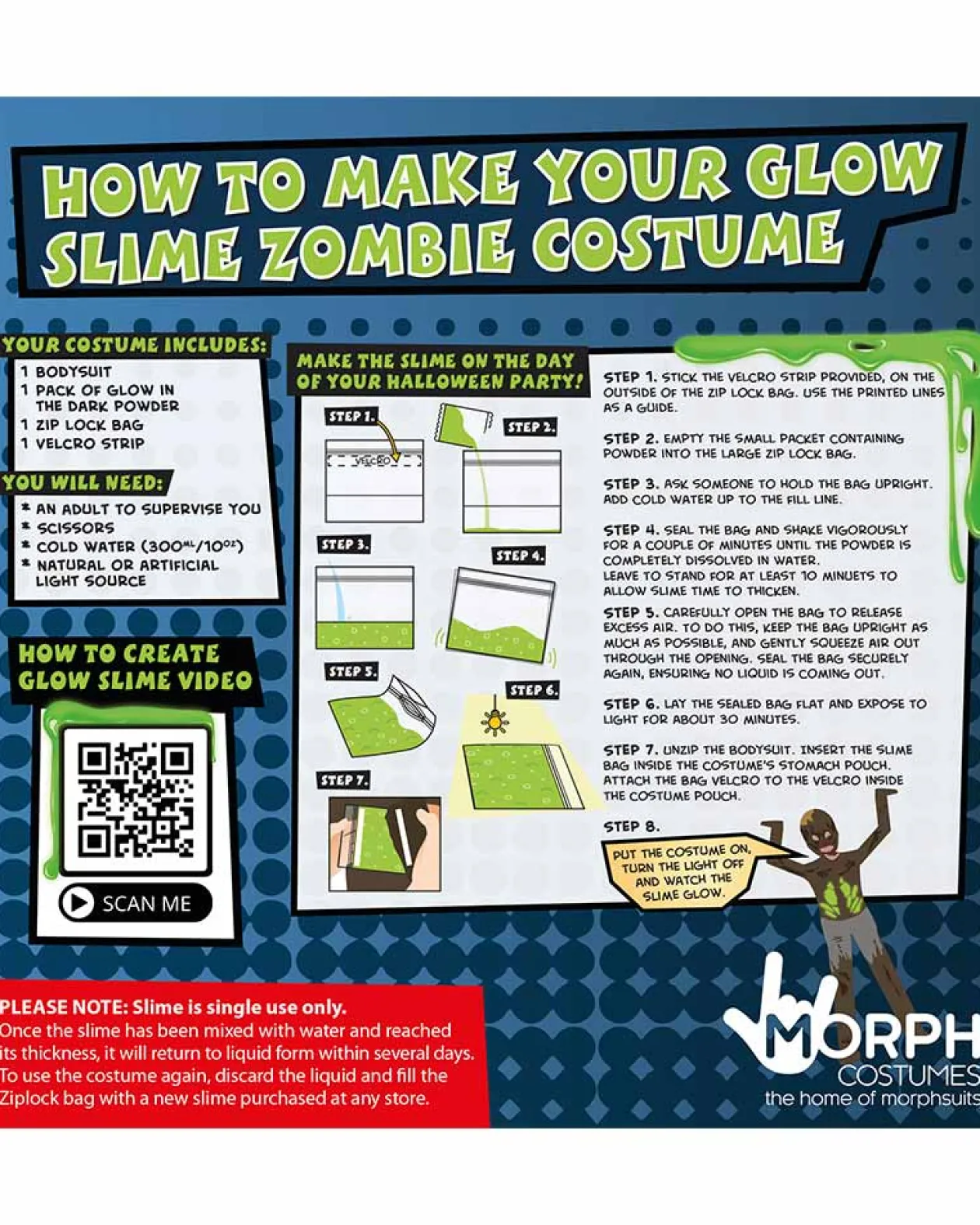People Will Need To Do A Double-Take Of Your Costume This Halloween If You Wear The Radioactive Morphsuit Kids Costume. Included Is A Scary Rotting Skeleton Printed Morphsuit And Glow-In-The-Dark Green Slime. The Slime Packet Fits Into The Costume To Make It Appear As Though Your Character Has Radioactive Insides! Gross! Simply Mix The Included Slime Ingredients And Charge Under A Light Source For Best Results On The Night Of Halloween.
