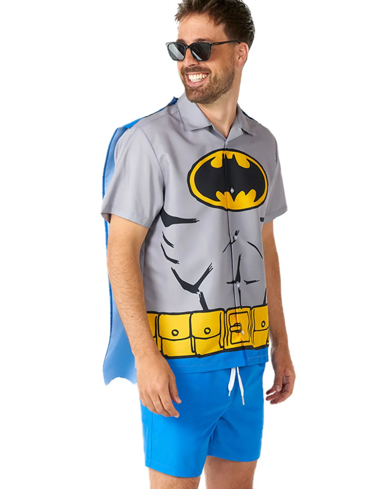 Be The Vigilante At The Pool In This Fun Batman Summer Combo Swim Suit. The Swim Suit Features A Printed Shirt In The Style Of The Grey And Blue Comic Book Batman Suit With An Attached Blue Cape And Matching Blue Swim Shorts. This Awesome Two-Piece Summer Combo Is Perfect For Themed Pool Parties. The Shirt Has A Collar And Button Down Front And The Shorts Have An Elasticated Drawstring Waist, 2 Side Pockets And 1 Back Pocket.