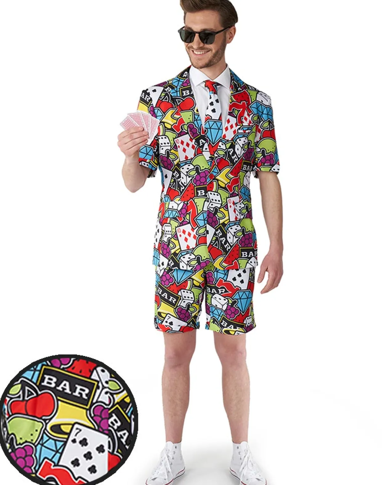 Hopefully, You’Ll Have Lady Luck On Your Side When You Roll Up Into The Casinos Wearing Our Casino Icons Mens Summer Suitmeister. Featuring A Jacket, Summer Pants, And A Tie Styled With Colourful Casino Icons. The Jacket Includes 2 Fake Pockets On The Front, One Inside Pocket, 2 Front Pockets, And 1 Back Pocket On The Trousers! Both The Trousers And Jacket Can Be Extended However As The Waist Is Elastic The Elastic Adjusts To The Wearer’s Size, For An Easy Fit!