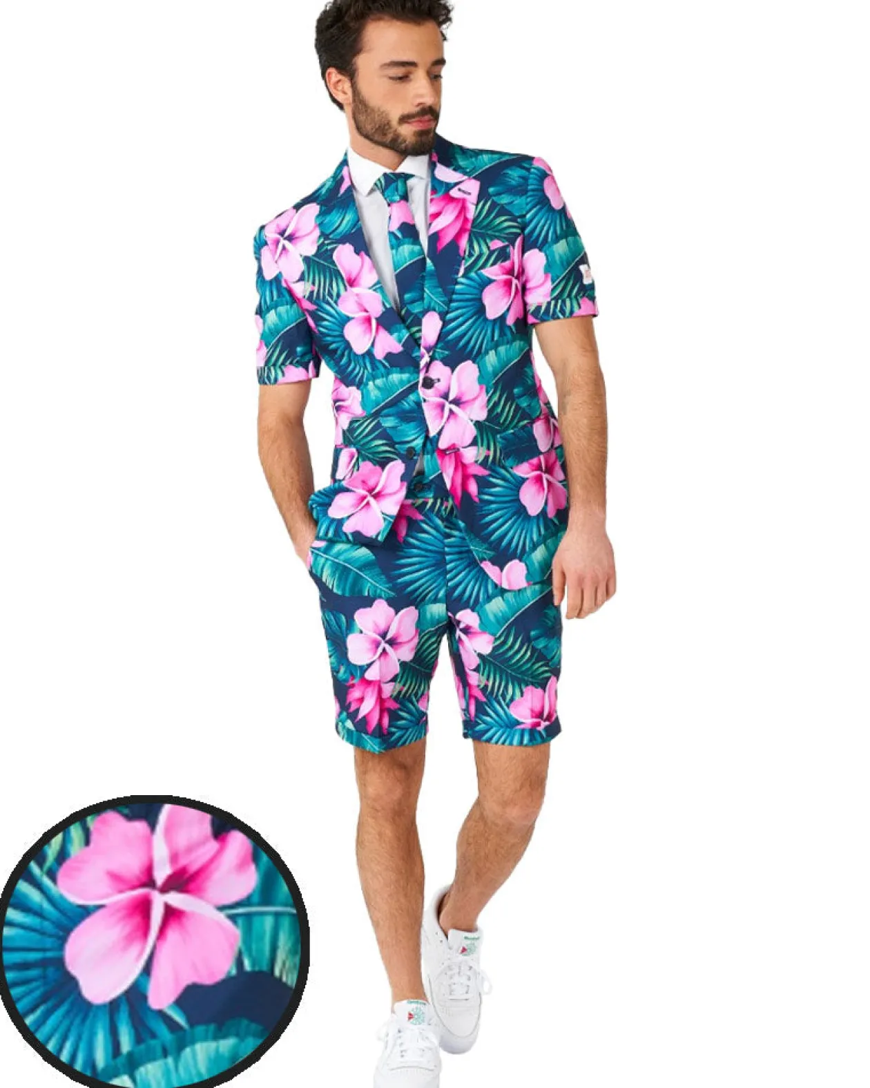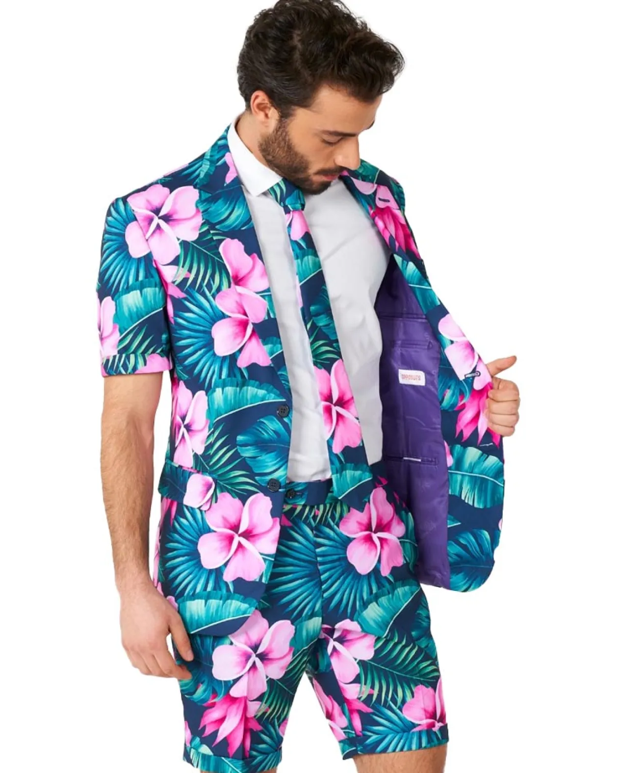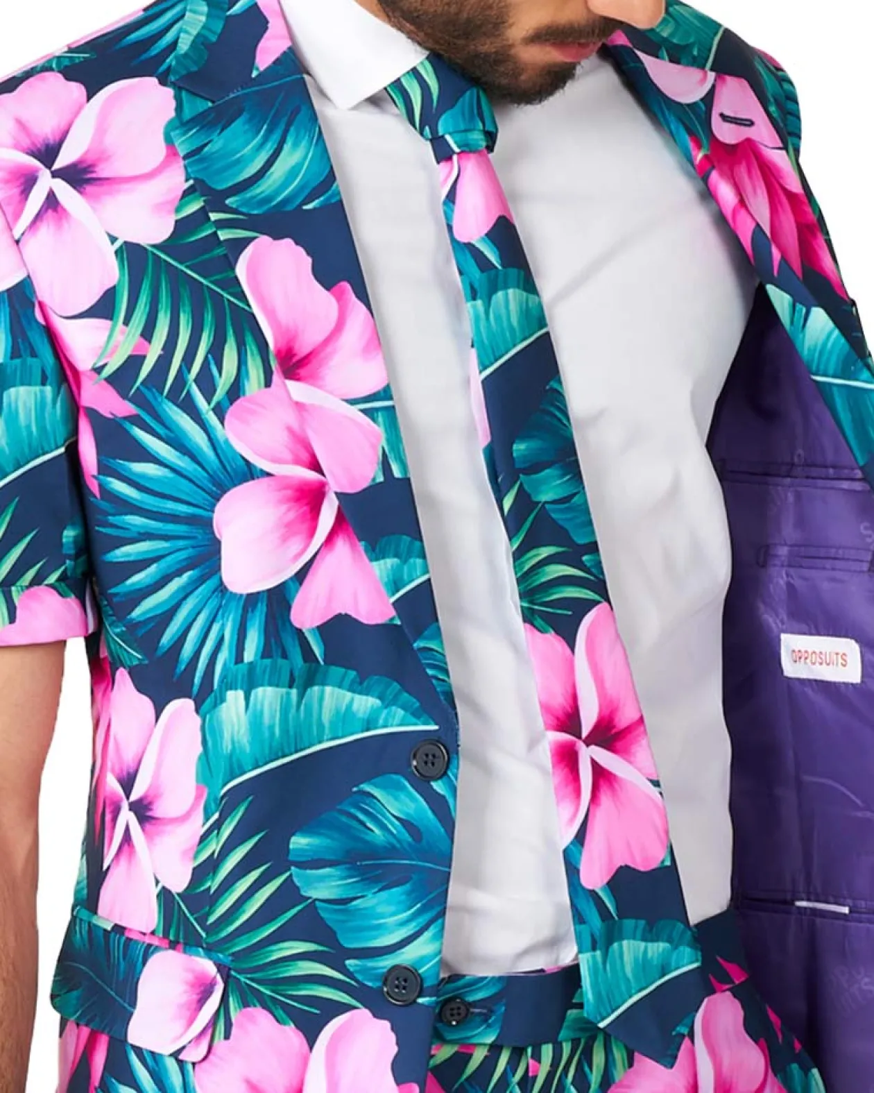 Have A Tropical Time In This Opposuit Summer Hawaii Grande Premium Mens Suit. Included Is A Short-Sleeved Suit Jacket, Tie And Shorts, All In A Matching Colourful Pattern Of Pale Magenta Frangipani Flowers On A Dark Sea Blue And Pale Pine Green Tropical Leaves Background. Jacket Is Fully Lined, With Notch Lapels, Padded Shoulders, Two-Button Front Closure, Front Flap Pockets, Left Chest Pocket, And Four Inside Pockets. Shorts Feature Belt Loops, Two Side Pockets, Two Back Button-Through Pockets, And A Zip Fly With Hook And Button Closure. This Premium Suit Will Take You From Day To Night All Summer Long–Perfect For Summer Events And Hawaiian Luau Parties Where You Want To Keep It Classy, Or A Bright And Tropical Twist On A Formal Dress Code.