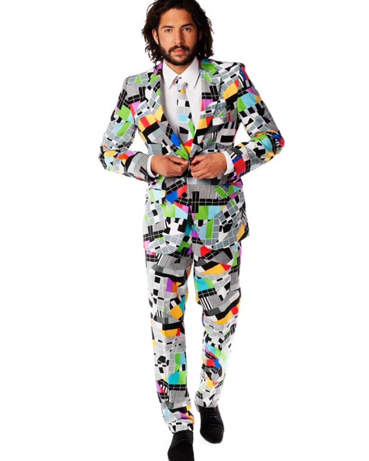Bright And Fun, The Opposuit Testival Premium Mens Suit Is Not For The Faint-Hearted! This Opposuit Includes Suit Quality Lined Jacket, Pants And Tie And Is Printed In A Colourful Design Inspired By The Retro Colour Bars Used In Early Broadcast Television. The Lined Jacket Features Inside And Outside Pockets And The Trousers Have Front Pockets And Back Pockets Attached With Buttons. This Suit Is Made From High-Quality Material And Is Designed To Fit, Look And Feel Like A Regular Suit, Only More Stylish! Perfect For Wearing To The Office, A Wedding Or The Weekend Races. Simply Add Your Own Shirt And You’Re Good To Go! If You’Re Unsure About Sizes We Recommend Picking The Larger Size Of The Two Suits As They Come In A Slim Fit. All Opposuit Pants And Jackets Are Lined With A Small Amount Of Additional Fabric So That If Desired, They May Be Tailored To Your Exact Length And Fit By An Alterations Business Or Tailor. Also, The Waistband Of Trousers Can Be Adjusted 2 Sizes Larger Or Smaller Than The Original Size.