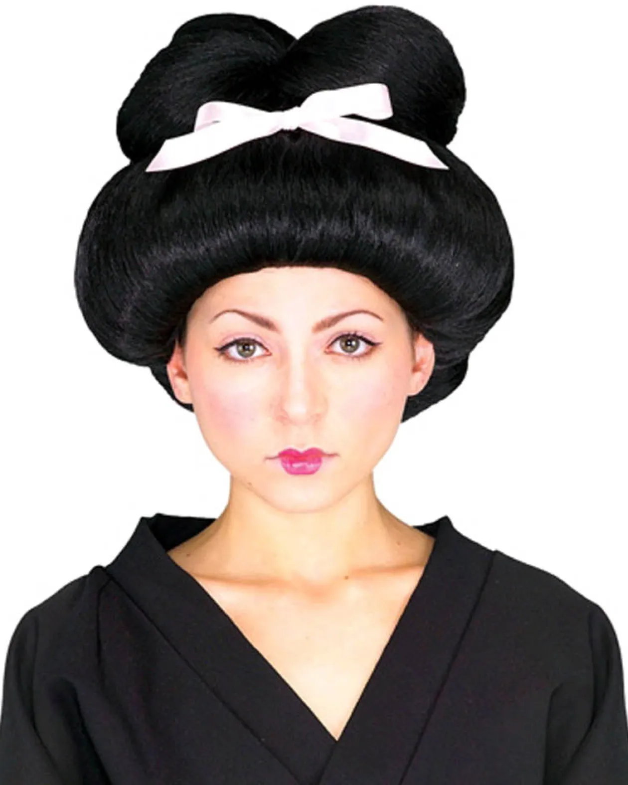 No Japanese Dress Up Look Is Complete Without Our Gorgeous Geisha Girl Black Wig With Pale Pink Bow. Wear This Elegant Up Do With A Wig Cap Underneath For A Smooth And Professional Look.