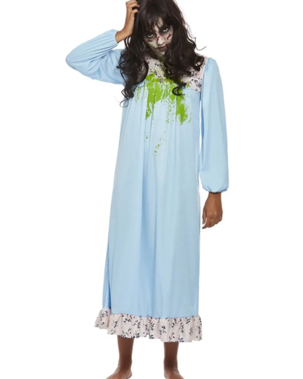 Nobody Will Mess With This Demon On Halloween When You Wear This Creepy Possessed Girl Womens Costume. The Costume Is Inspired By The Possessed Character Regan In The Film The Exorcist And Comes As A Blue Night Dress With Floral Trimming At The Skirt Hem And Neck, As Well As Featuring Printed Green Vomit At The Chest. Pair With A Brown Wig And Some Creepy Makeup, And You’Re All Set To Scare On Halloween Or Your Next Horror Movie-Themed Party.